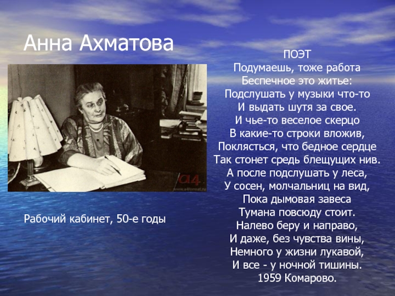 Она работает до последних дней своей жизни над «Поэмой без героя», которая так и осталась незавершенной и стала лучшим произведением Анны Андреевны.