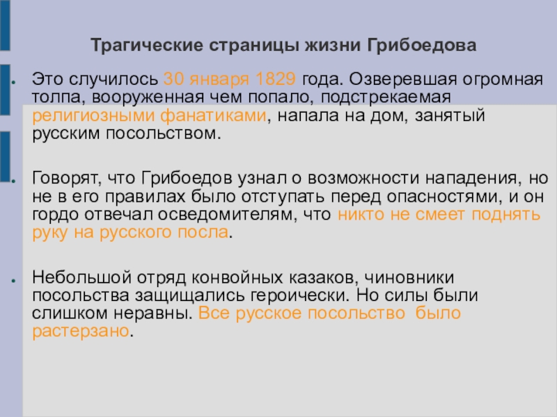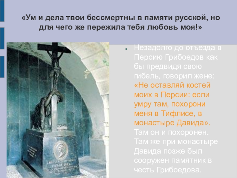 Незадолго до отъезда в Персию Грибоедов как бы предвидя свою гибель, говорил жене: «Не оставляй костей моих в Персии: если умру там, похорони меня в Тифлисе, в монастыре Давида». Там он и похоронен. Там же при монастыре Давида позже был сооружен памятник в честь Грибоедова.