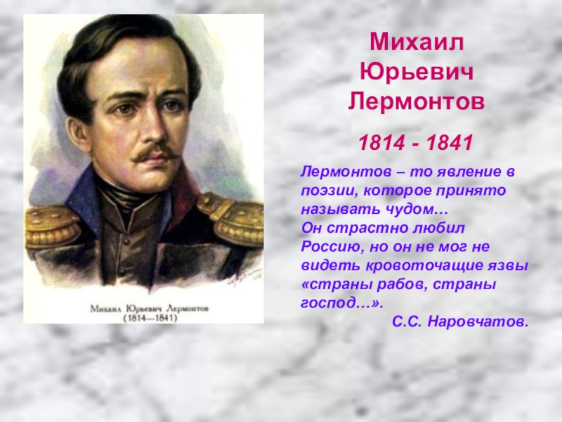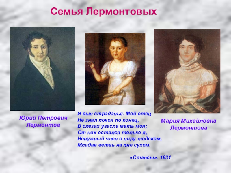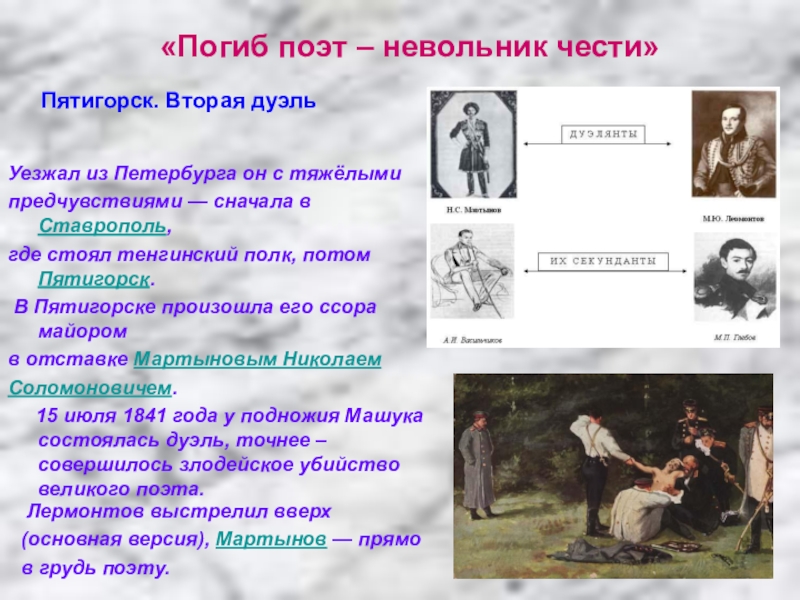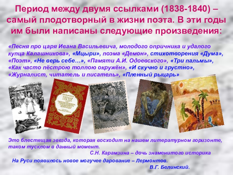 «Песня про царя Ивана Васильевича, молодого опричника и удалого купца Калашникова», «Мцыри», поэма «Демон», стихотворения «Дума», «Поэт», «Не верь себе…», «Памяти А.И. Одоевского», «Три пальмы», «Как часто пёстрою толпою окружён», «И скучно и грустно», «Журналист, читатель и писатель», «Пленный рыцарь»