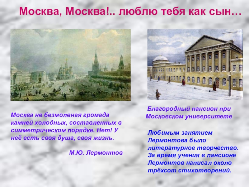 Любимым занятием Лермонтова было литературное творчество. За время учения в пансионе Лермонтов написал около трёхсот стихотворений.