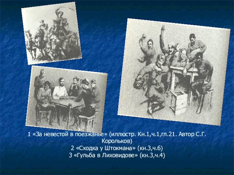 1 «За невестой в поезжанье» (иллюстр. Кн.1,ч.1,гл.21. Автор С.Г.Корольков) 2 «Сходка у Штокмана» (кн.3,ч.6) 3 «Гульба в
