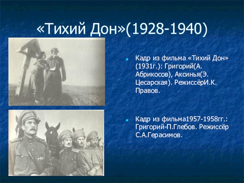 «Тихий Дон»(1928-1940)Кадр из фильма «Тихий Дон» (1931г.): Григорий(А.Абрикосов), Аксинья(Э.Цесарская). РежиссёрИ.К.Правов.Кадр из фильма1957-1958гг.:Григорий-П.Глебов. Режиссёр С.А.Герасимов.