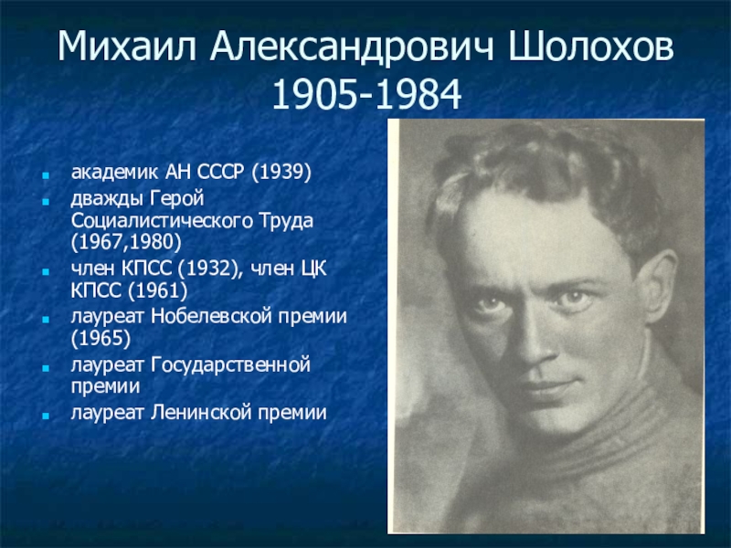 Михаил Александрович Шолохов 1905-1984академик АН СССР (1939)дважды Герой Социалистического Труда (1967,1980)член КПСС (1932), член ЦК КПСС (1961)лауреат Нобелевской премии (1965)лауреат Государственной премиилауреат Ленинской премии