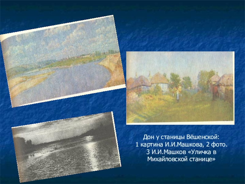 Слайд 20Дон у станицы Вёшенской: 1 картина И.И.Машкова, 2 фото. 3 И.И.Машков «Уличка в