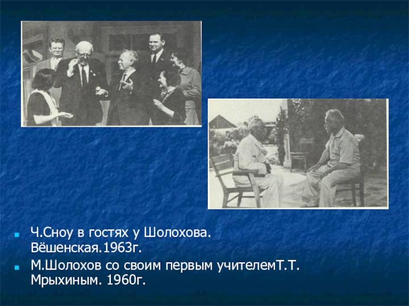 Ч.Сноу в гостях у Шолохова. Вёшенская.1963г.М.Шолохов со своим первым учителемТ.Т.Мрыхиным. 1960г.