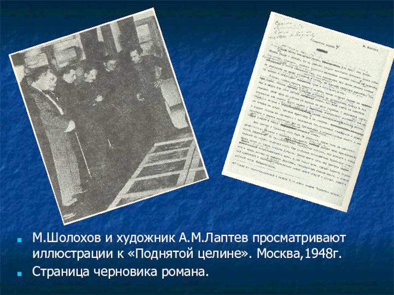 Слайд 9М.Шолохов и художник А.М.Лаптев просматривают иллюстрации к «Поднятой целине». Москва,1948г.