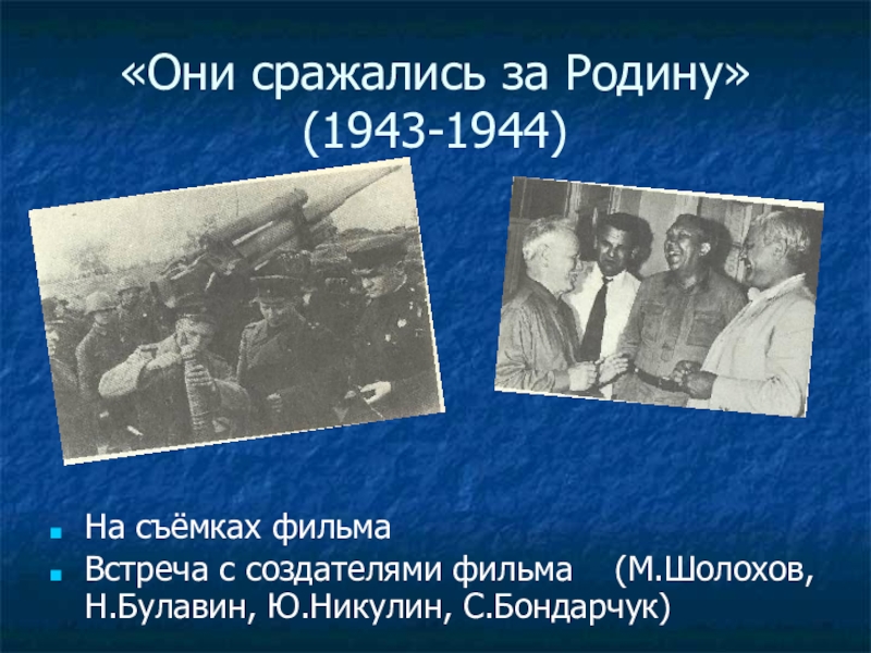 «Они сражались за Родину»(1943-1944)На съёмках фильмаВстреча с создателями фильма  (М.Шолохов, Н.Булавин, Ю.Никулин, С.Бондарчук)