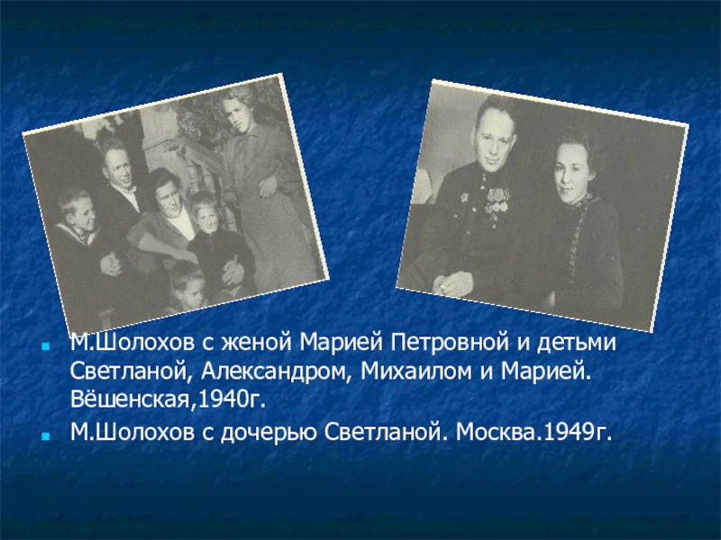 М.Шолохов с женой Марией Петровной и детьми Светланой, Александром, Михаилом и Марией. Вёшенская,1940г.М.Шолохов с дочерью Светланой. Москва.1949г.