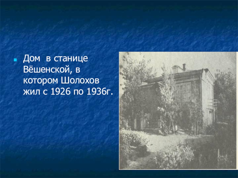 Слайд 4Дом в станице Вёшенской, в котором Шолохов жил с 1926 по