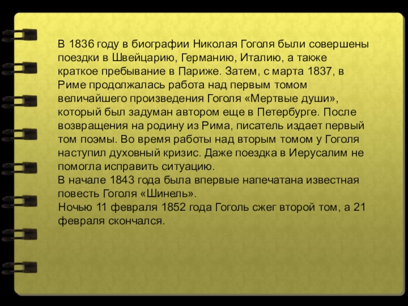 Швейцарию, Германию, Италию, а также краткое пребывание в Париже. Затем, с марта 1837, в Риме продолжалась работа над первым томом величайшего произведения Гоголя «Мертвые души», который был задуман автором еще в Петербурге. После возвращения на родину из Рима, писатель издает первый том поэмы. Во время работы над вторым томом у Гоголя наступил духовный кризис. Даже поездка в Иерусалим не помогла исправить ситуацию.