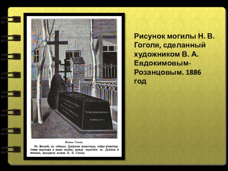 Слайд 11Рисунок могилы Н. В. Гоголя, сделанный художником В. А. Евдокимовым-Розанцовым. 1886