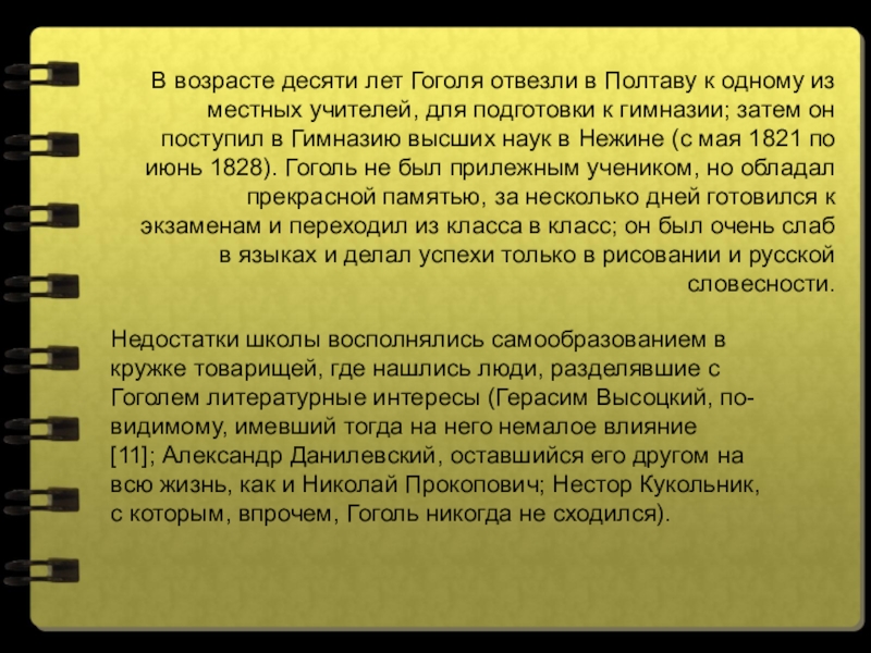 подготовки к гимназии; затем он поступил в Гимназию высших наук в Нежине (с мая 1821 по июнь 1828). Гоголь не был прилежным учеником, но обладал прекрасной памятью, за несколько дней готовился к экзаменам и переходил из класса в класс; он был очень слаб в языках и делал успехи только в рисовании и русской словесности.