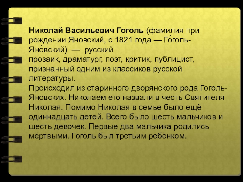 Слайд 2Николай Васильевич Гоголь (фамилия при рождении Яновский, с 1821 года — Го́голь-Яно́вский) — русский