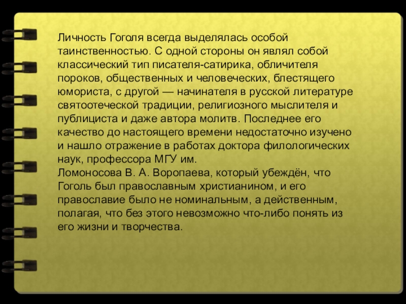 собой классический тип писателя-сатирика, обличителя пороков, общественных и человеческих, блестящего юмориста, с другой — начинателя в русской литературе святоотеческой традиции, религиозного мыслителя и публициста и даже автора молитв. Последнее его качество до настоящего времени недостаточно изучено и нашло отражение в работах доктора филологических наук, профессора МГУ им. Ломоносова В. А. Воропаева, который убеждён, что Гоголь был православным христианином, и его православие было не номинальным, а действенным, полагая, что без этого невозможно что-либо понять из его жизни и творчества.