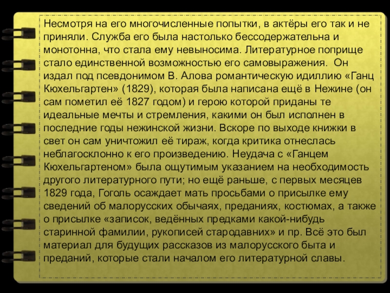 его была настолько бессодержательна и монотонна, что стала ему невыносима. Литературное поприще стало единственной возможностью его самовыражения. Он издал под псевдонимом В. Алова романтическую идиллию «Ганц Кюхельгартен» (1829), которая была написана ещё в Нежине (он сам пометил её 1827 годом) и герою которой приданы те идеальные мечты и стремления, какими он был исполнен в последние годы нежинской жизни. Вскоре по выходе книжки в свет он сам уничтожил её тираж, когда критика отнеслась неблагосклонно к его произведению. Неудача с «Ганцем Кюхельгартеном» была ощутимым указанием на необходимость другого литературного пути; но ещё раньше, с первых месяцев 1829 года, Гоголь осаждает мать просьбами о присылке ему сведений об малорусских обычаях, преданиях, костюмах, а также о присылке «записок, ведённых предками какой-нибудь старинной фамилии, рукописей стародавних» и пр. Всё это был материал для будущих рассказов из малорусского быта и преданий, которые стали началом его литературной славы.
