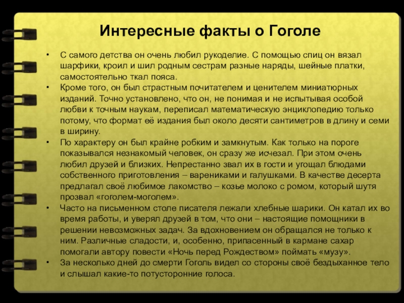 Часто на письменном столе писателя лежали хлебные шарики. Он катал их во время работы, и уверял друзей в том, что они – настоящие помощники в решении невозможных задач. За вдохновением он обращался не только к ним. Различные сладости, и, особенно, припасенный в кармане сахар помогали автору повести «Ночь перед Рождеством» поймать «музу».