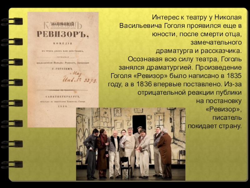 Осознавая всю силу театра, Гоголь занялся драматургией. Произведение Гоголя «Ревизор» было написано в 1835 году, а в 1836 впервые поставлено. Из-за отрицательной реакции публики