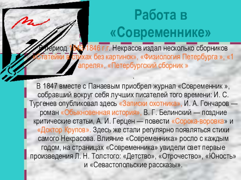 В 1847 вместе с Панаевым приобрел журнал «Современник », собравший вокруг себя лучших писателей того времени: И. С. Тургенев опубликовал здесь «Записки охотника», И. А. Гончаров — роман «Обыкновенная история», В. Г. Белинский — поздние критические статьи, А. И. Герцен — повести «Сорока-воровка» и «Доктор Крупов». Здесь же стали регулярно появляться стихи самого Некрасова. Влияние «Современника» росло с каждым годом, на страницах «Современника» увидели свет первые произведения Л. Н. Толстого: «Детство», «Отрочество», «Юность» и «Севастопольские рассказы».