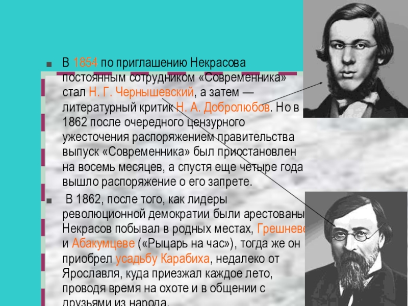 Чернышевский, а затем — литературный критик Н. А. Добролюбов. Но в 1862 после очередного цензурного ужесточения распоряжением правительства выпуск «Современника» был приостановлен на восемь месяцев, а спустя еще четыре года вышло распоряжение о его запрете.