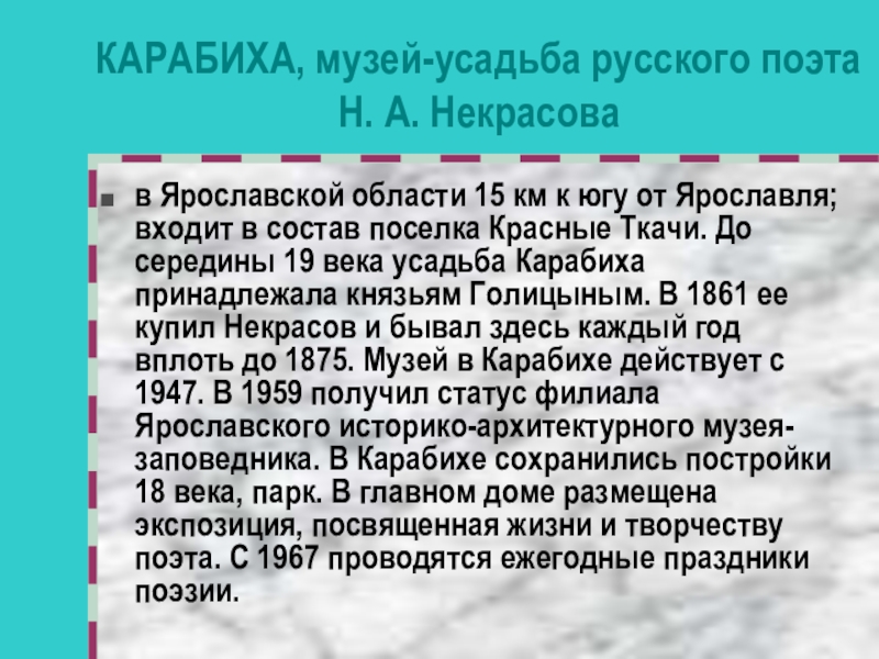 к югу от Ярославля; входит в состав поселка Красные Ткачи. До середины 19 века усадьба Карабиха принадлежала князьям Голицыным. В 1861 ее купил Некрасов и бывал здесь каждый год вплоть до 1875. Музей в Карабихе действует с 1947. В 1959 получил статус филиала Ярославского историко-архитектурного музея-заповедника. В Карабихе сохранились постройки 18 века, парк. В главном доме размещена экспозиция, посвященная жизни и творчеству поэта. С 1967 проводятся ежегодные праздники поэзии.