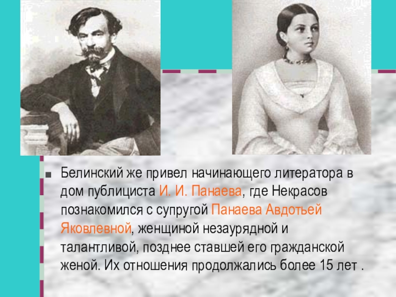 где Некрасов познакомился с супругой Панаева Авдотьей Яковлевной, женщиной незаурядной и талантливой, позднее ставшей его гражданской женой. Их отношения продолжались более 15 лет .