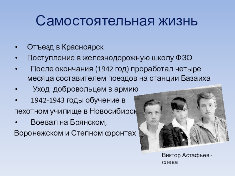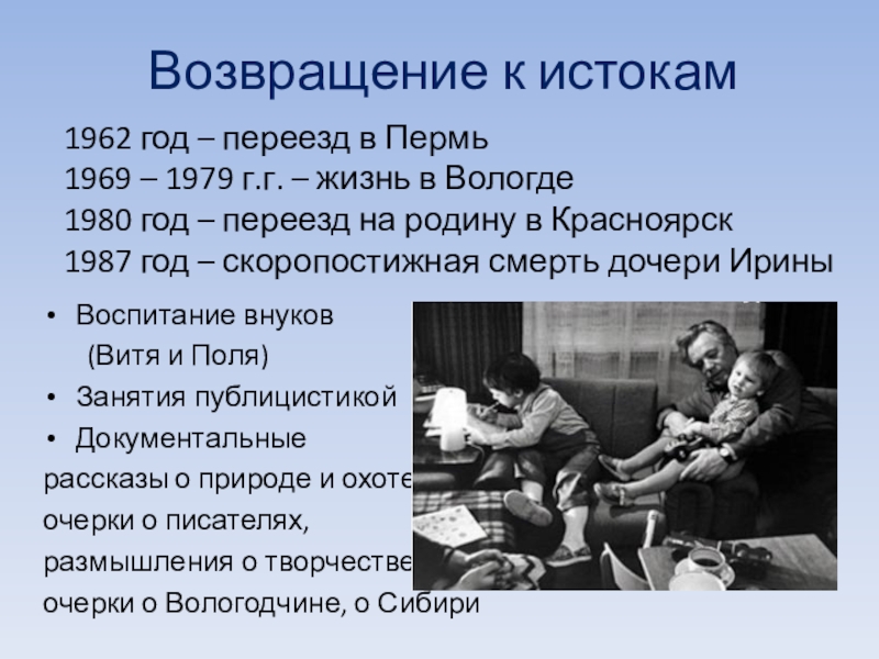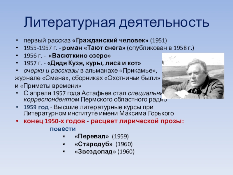 С 1978-го по 1982-й год Астафьев работал над повестью «Зрячий посох», изданной в 1988 году