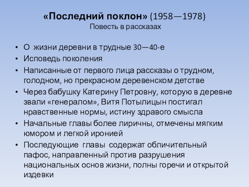 В повести «Последний поклон» (1968) он пишет: «Нет на свете ничего подлее русского тупого терпения, разгильдяйства и беспечности».
