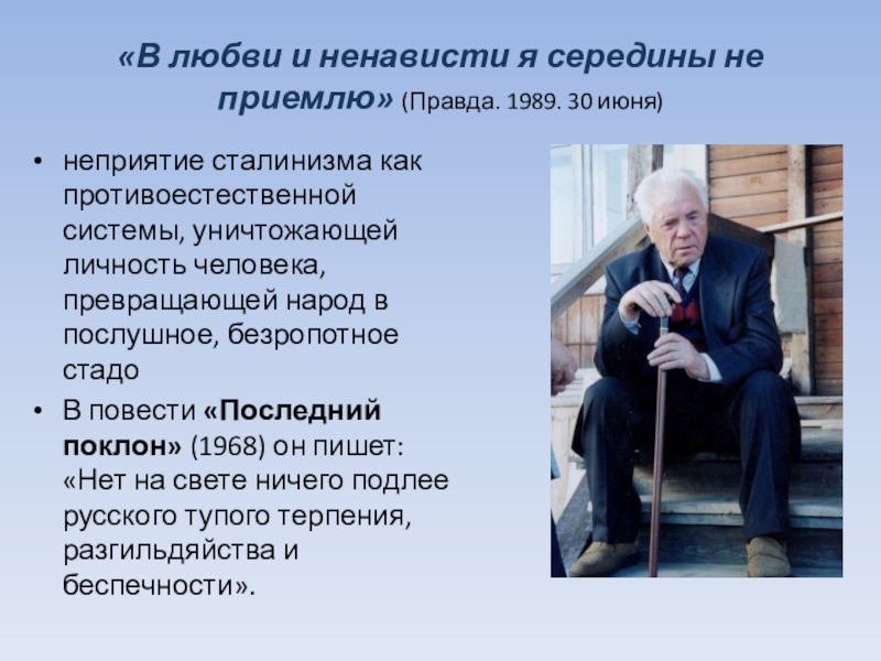 неприятие сталинизма как противоестественной системы, уничтожающей личность человека, превращающей народ в послушное, безропотное стадо
