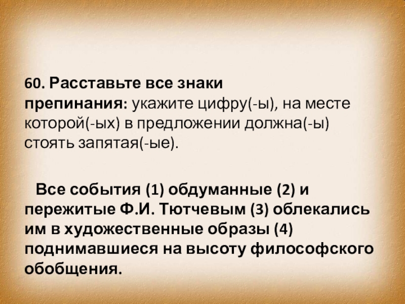 Все события (1) обдуманные (2) и пережитые Ф.И. Тютчевым (3) облекались им в художественные образы (4) поднимавшиеся на высоту философского обобщения.