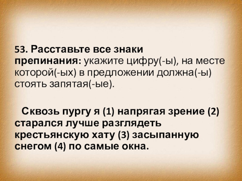 Сквозь пургу я (1) напрягая зрение (2) старался лучше разглядеть крестьянскую хату (3) засыпанную снегом (4) по самые окна.