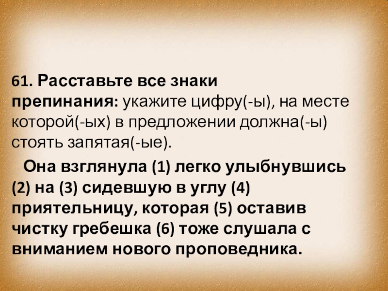Слайд 7061. Расставьте все знаки препинания: укажите цифру(-ы), на месте которой(-ых) в предложении должна(-ы)