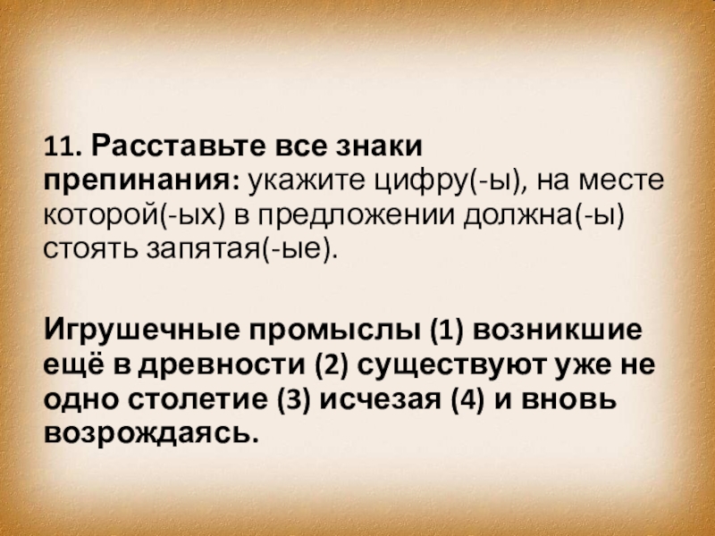 Слайд 2011. Расставьте все знаки препинания: укажите цифру(-ы), на месте которой(-ых) в предложении должна(-ы)