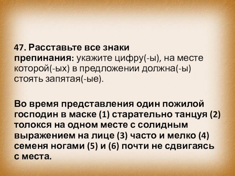 Слайд 5647. Расставьте все знаки препинания: укажите цифру(-ы), на месте которой(-ых) в предложении должна(-ы)