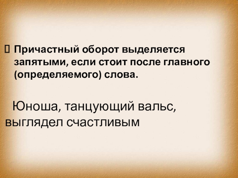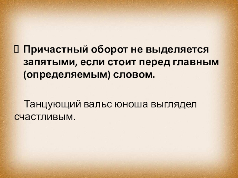 Слайд 3Причастный оборот не выделяется запятыми, если стоит перед главным (определяемым) словом.
