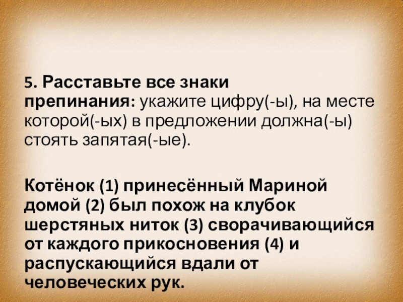 Котёнок (1) принесённый Мариной домой (2) был похож на клубок шерстяных ниток (3) сворачивающийся от каждого прикосновения (4) и распускающийся вдали от человеческих рук.