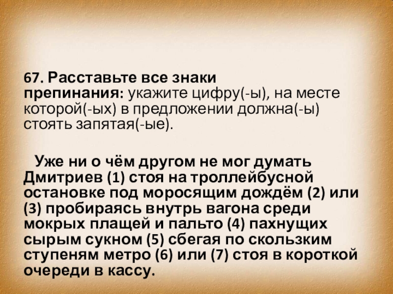 Слайд 7667. Расставьте все знаки препинания: укажите цифру(-ы), на месте которой(-ых) в предложении должна(-ы)