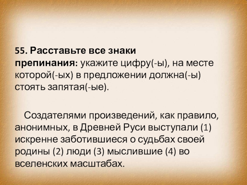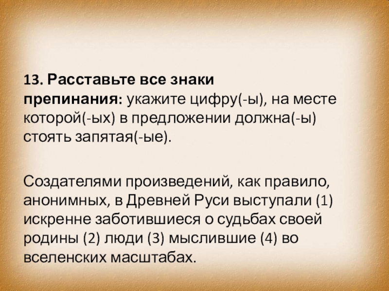 Создателями произведений, как правило, анонимных, в Древней Руси выступали (1) искренне заботившиеся о судьбах своей родины (2) люди (3) мыслившие (4) во вселенских масштабах.