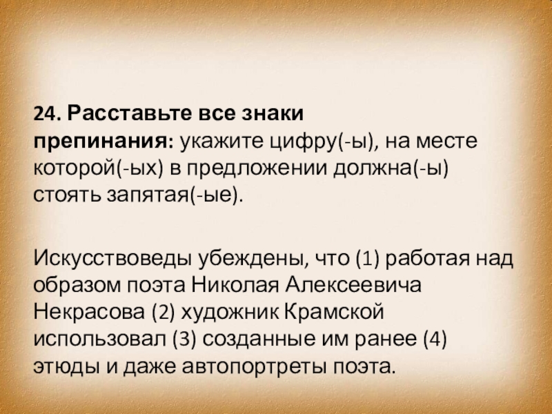 Искусствоведы убеждены, что (1) работая над образом поэта Николая Алексеевича Некрасова (2) художник Крамской использовал (3) созданные им ранее (4) этюды и даже автопортреты поэта.
