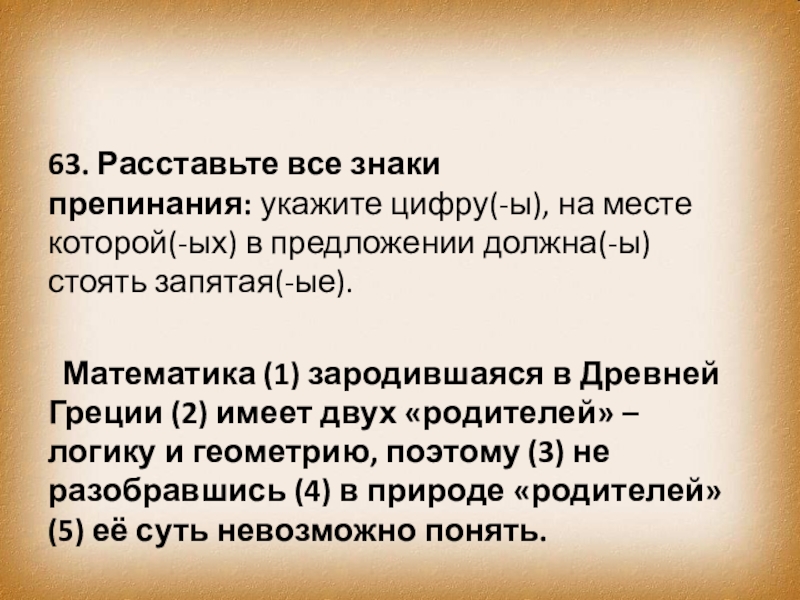 Математика (1) зародившаяся в Древней Греции (2) имеет двух «родителей» – логику и геометрию, поэтому (3) не разобравшись (4) в природе «родителей» (5) её суть невозможно понять.