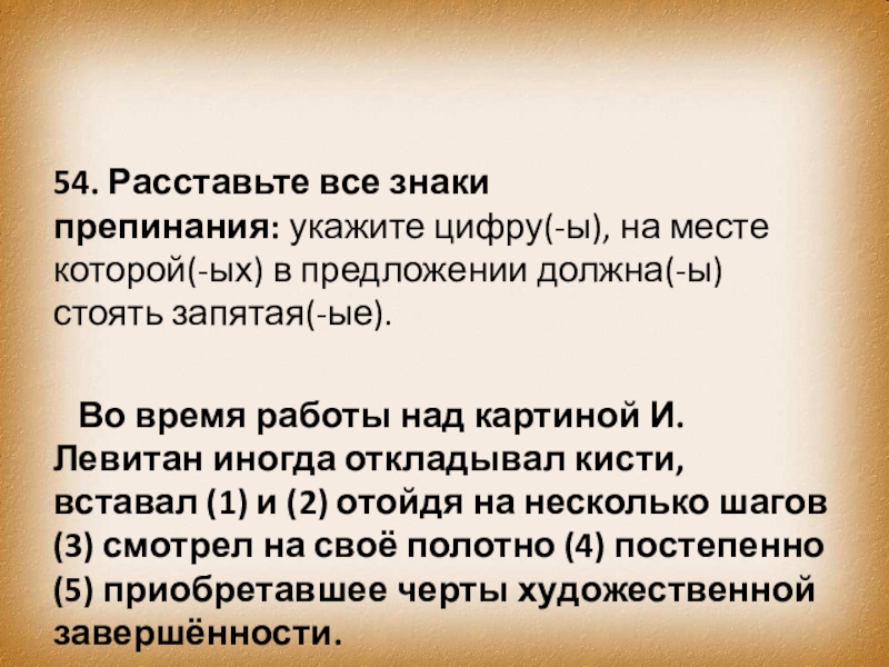Во время работы над картиной И. Левитан иногда откладывал кисти, вставал (1) и (2) отойдя на несколько шагов (3) смотрел на своё полотно (4) постепенно (5) приобретавшее черты художественной завершённости.