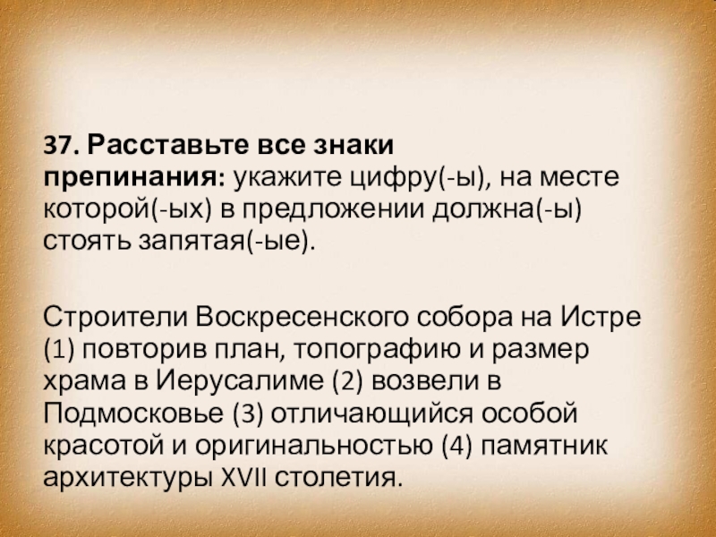 Строители Воскресенского собора на Истре (1) повторив план, топографию и размер храма в Иерусалиме (2) возвели в Подмосковье (3) отличающийся особой красотой и оригинальностью (4) памятник архитектуры XVII столетия.