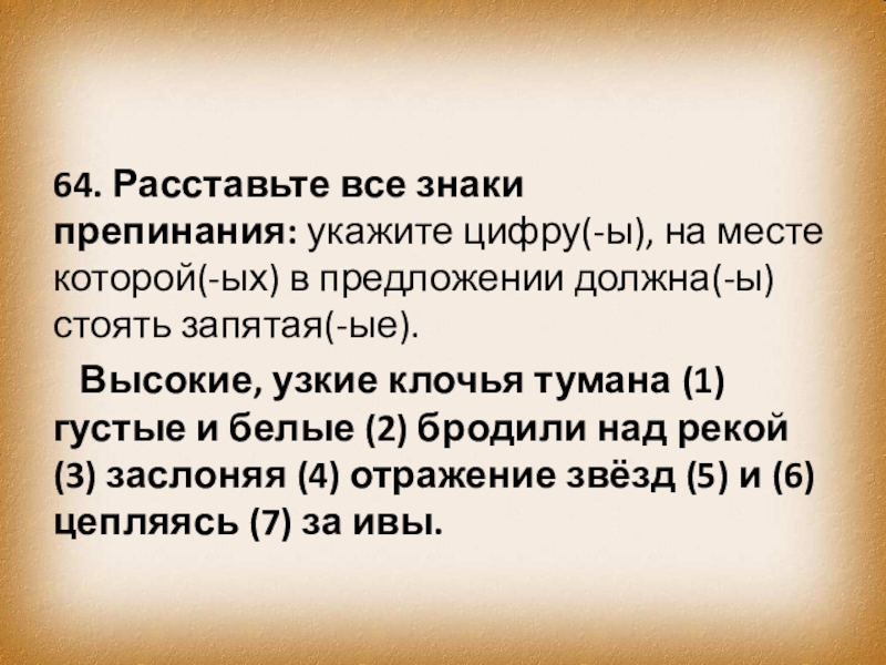 Высокие, узкие клочья тумана (1) густые и белые (2) бродили над рекой (3) заслоняя (4) отражение звёзд (5) и (6) цепляясь (7) за ивы.