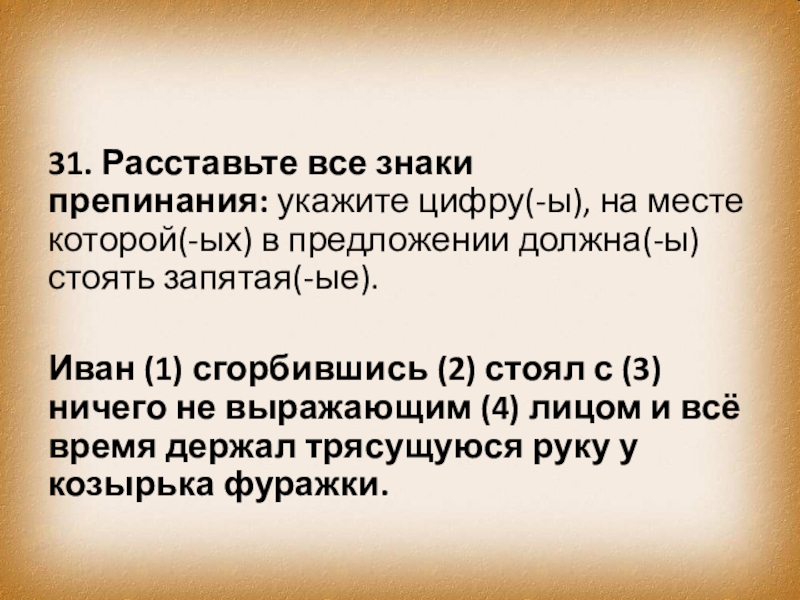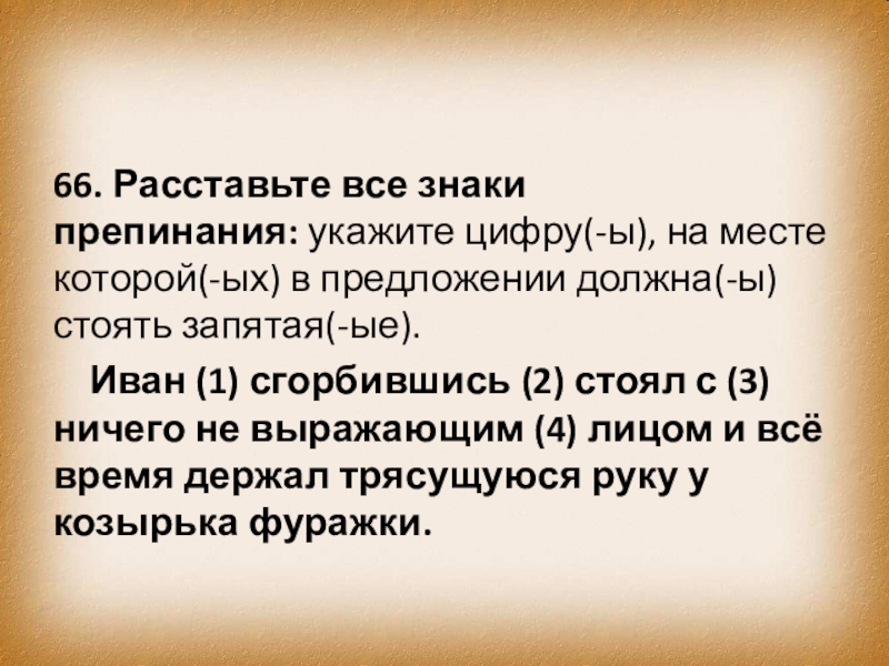 Иван (1) сгорбившись (2) стоял с (3) ничего не выражающим (4) лицом и всё время держал трясущуюся руку у козырька фуражки.