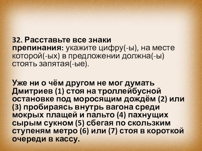 Уже ни о чём другом не мог думать Дмитриев (1) стоя на троллейбусной остановке под моросящим дождём (2) или (3) пробираясь внутрь вагона среди мокрых плащей и пальто (4) пахнущих сырым сукном (5) сбегая по скользким ступеням метро (6) или (7) стоя в короткой очереди в кассу.