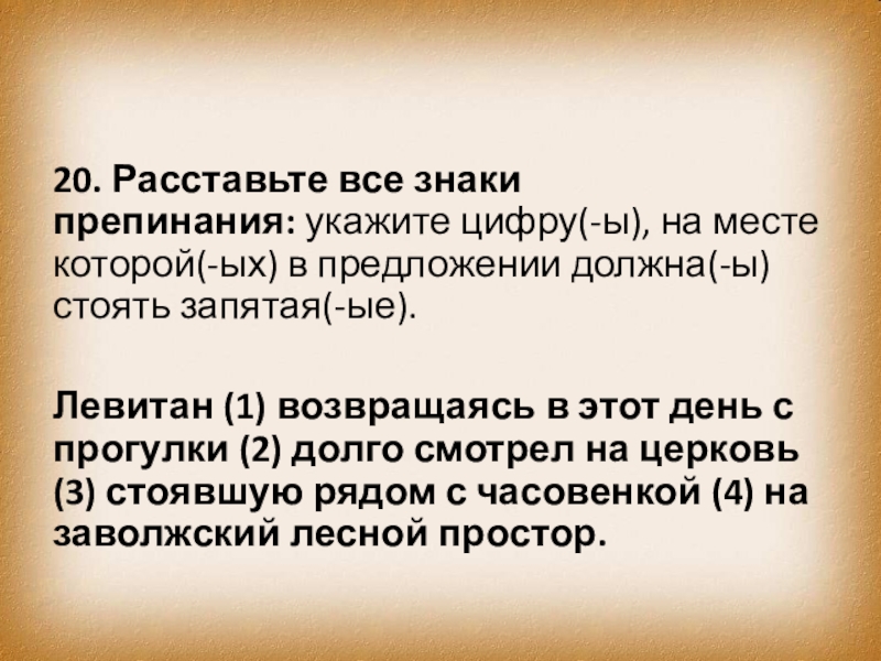 Слайд 2920. Расставьте все знаки препинания: укажите цифру(-ы), на месте которой(-ых) в предложении должна(-ы)