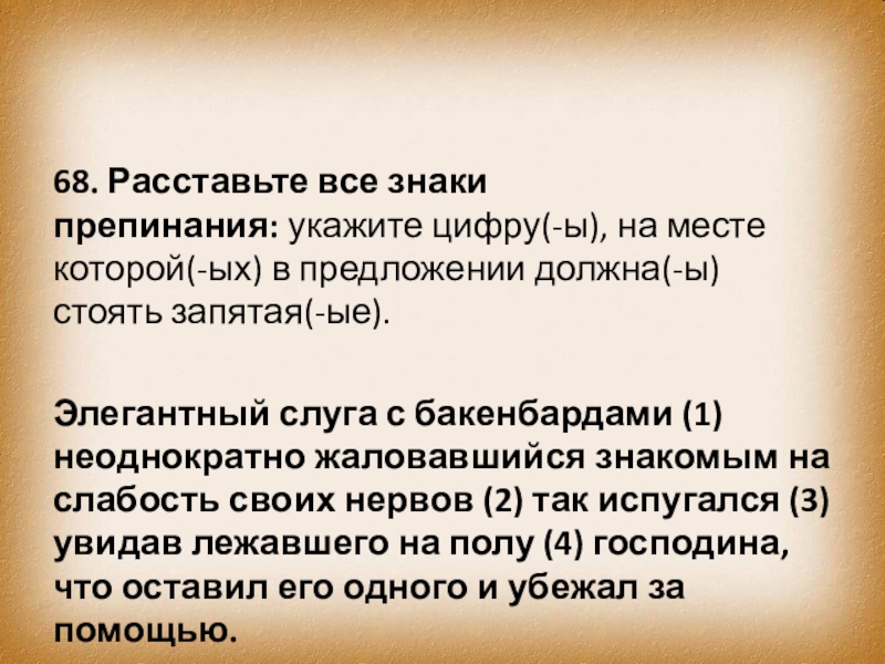 Элегантный слуга с бакенбардами (1) неоднократно жаловавшийся знакомым на слабость своих нервов (2) так испугался (3) увидав лежавшего на полу (4) господина, что оставил его одного и убежал за помощью.