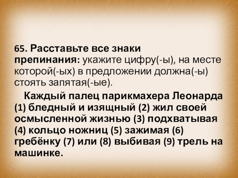 Каждый палец парикмахера Леонарда (1) бледный и изящный (2) жил своей осмысленной жизнью (3) подхватывая (4) кольцо ножниц (5) зажимая (6) гребёнку (7) или (8) выбивая (9) трель на машинке.