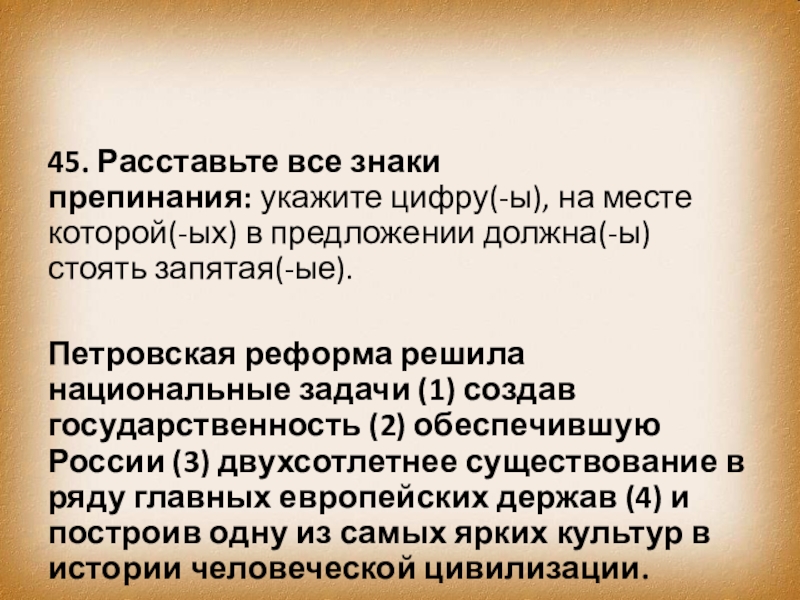 Слайд 5445. Расставьте все знаки препинания: укажите цифру(-ы), на месте которой(-ых) в предложении должна(-ы)