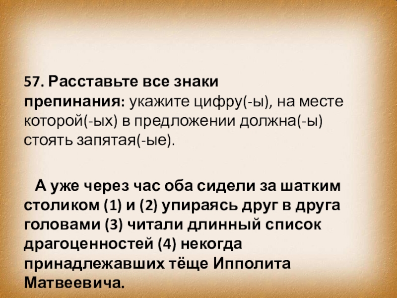 А уже через час оба сидели за шатким столиком (1) и (2) упираясь друг в друга головами (3) читали длинный список драгоценностей (4) некогда принадлежавших тёще Ипполита Матвеевича.