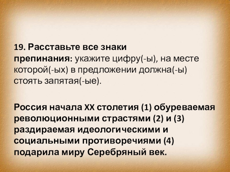Слайд 2819. Расставьте все знаки препинания: укажите цифру(-ы), на месте которой(-ых) в предложении должна(-ы)